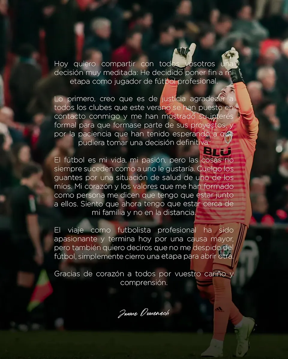 今夏のジャウメには、国内外の複数のクラブチームからのオファーが届いていました。しかし、ジャウメは娘さんの健康問題を理由に、グローブを外してアルメナラの自宅に留まる決断を下しました。彼が最後に出場した試合は2024年5月5日のメスタージャでのアラベス戦となりました。